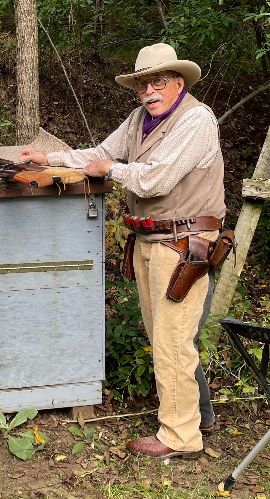 It is with great sorrow that I report the passing of Pokey Packrat aka Larry Waun, on December 28, 2023. Larry was one of the original Johnson Creek Regulators and was active until a few years due to health concerns. Larry built our famous Running Buffalo target, the Heaven or Hell Side match prop and many other targets and accessories. He built a gallows and put together "Tuco", a life sized dummy for for our Good, Bad and Ugly stages. He will be missed by all who knew him. Lilian Waun was a fixture at our parties, matches and get together. Please send your Prayers her way. Arrangements are posted on the Johnson Creek Regulators Face Book page. Godspeed Pokey!!